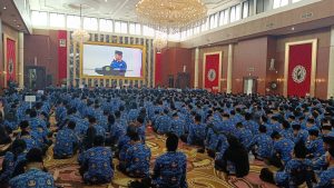 “Mari gemuruhkan semangat maju terus korps KORPRI. Kita harus terus memajukan lembaga kita dengan kerja keras, disiplin, dan profesionalitas,” ujarnya penuh semangat.