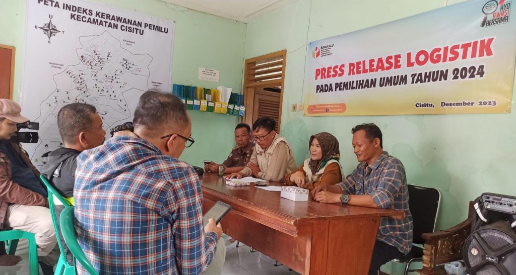 FAJARNUSANTARA, SUMEDANG – Panwaslu Kecamatan (Panwascam) Cisitu mengadakan pers release terkait pengawasan logistik Pemilu 2024 di sekretariat Panwaslu Kecamatan Cisitu, Rabu (6/12/2023). Ketua Panwascam Cisitu, Prabudi Eltaufan mengatakan bahwa kesiapan logistik di Kecamatan Cisitu secara teknis sudah siap hampir 90%.