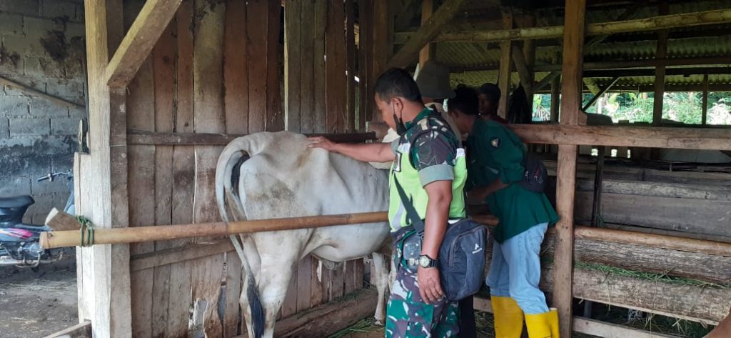 FAJAR NUSANTARA.COM,- Babinsa Koramil 1007/Conggeang melakukan pemantauan ke sejumlah peternak sapi diwilayah binatang, memastikan kesehatan hewan untuk mencegah penyebaran Penyakit Mulut dan Kuku (PMK) bersama UPTD Peternakan sambil melakukan Vaksinasi. Jumat 04 November 2022.