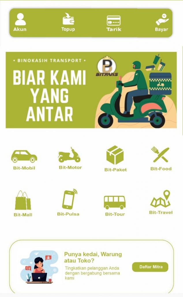 Tidak lebih dari aplikasi online layaknya GoJek dan juga Grab, aplikasi BiTrans tersedia juga di Google PlayStore, ada aplikasi khusus klien dan juga driver.