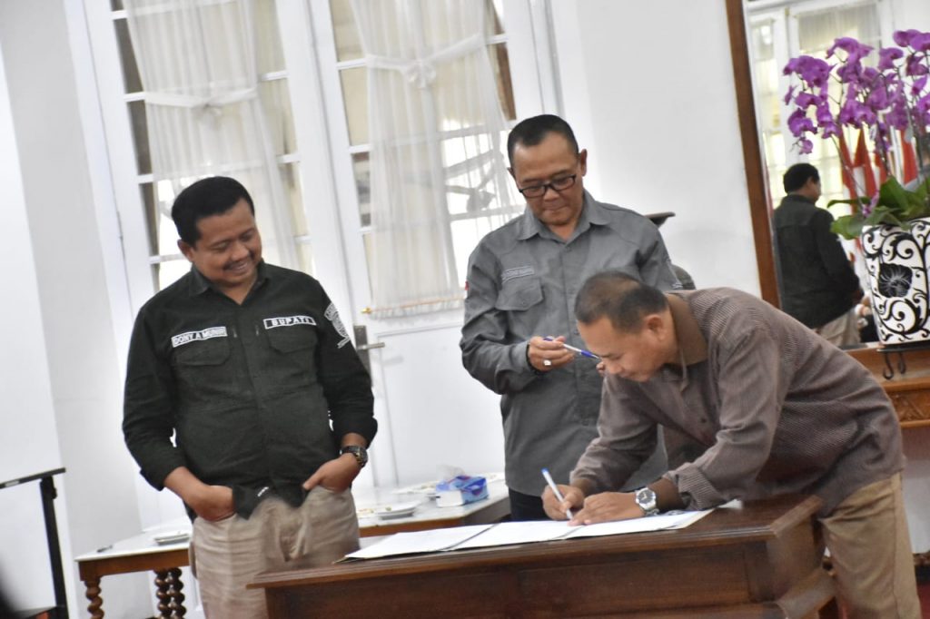 Penandatanganan naskah perjanjian hibah daerah (NPHD) dilakukan Kepala Badan Kesbangpol H Asep Tatang Sujana bersama para pimpinan Parpol dengan disaksikan Bupati Sumedang H. Dony Ahmad Munir, di Gedung Negara, Selasa (14/6/2022).