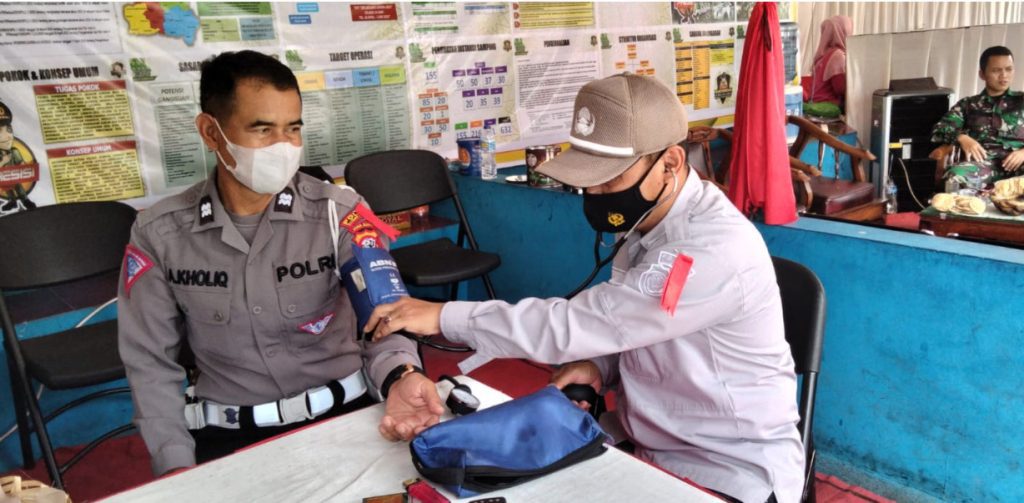Petugas Dokkes Polres Sumedang, Briptu Andika dan Pengtu Suhendro melakukan pemeriksaan tekanan darah kepada personel yang bertugas di Pos Pam Sumedang Selatan. Selain itu, mereka juga memberikan himbauan terkait menjaga kesehatan dengan menerapkan pola makan dan pola hidup sehat.