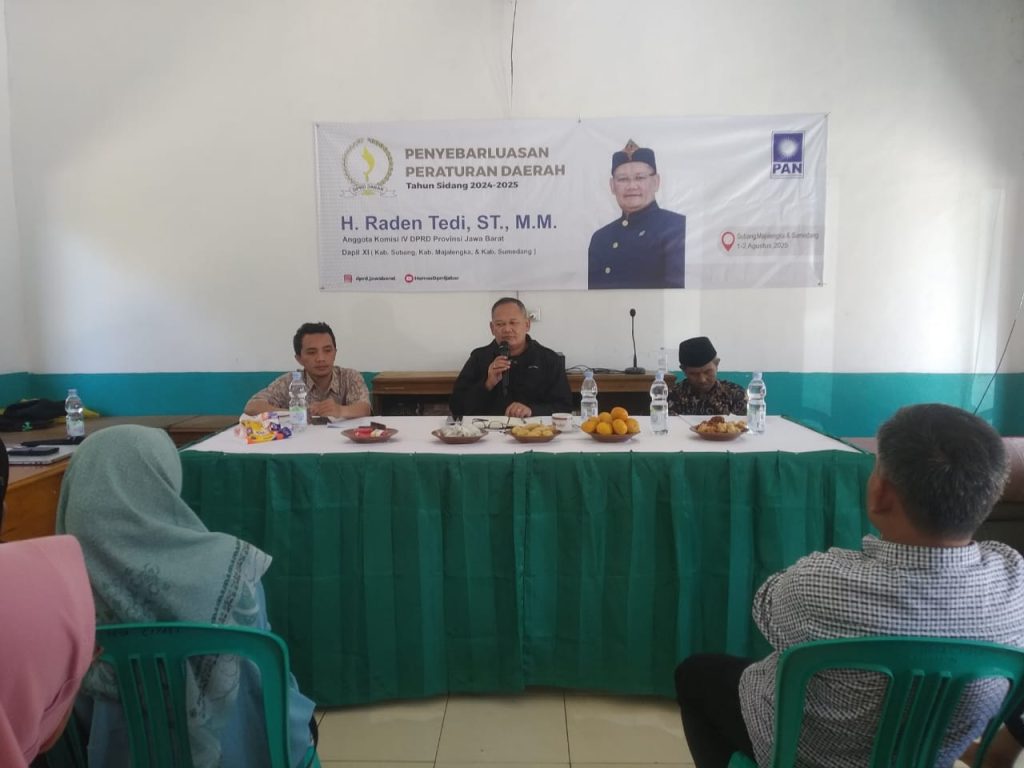 FAJARNUSANTARA.COM- Anggota DPRD Jawa Barat dari Fraksi PAN, H. Raden Tedi, menyosialisasikan Peraturan Daerah (Perda) No. 4 Tahun 2023 tentang Rencana Perlindungan dan Pengelolaan Lingkungan Hidup kepada masyarakat Kecamatan Pamulihan, Kabupaten Sumedang, Sabtu (2/8/2025). Kegiatan berlangsung di Majelis Ta’lim Al-Furqon, Kampung Lemahnendeut, Desa Citali.