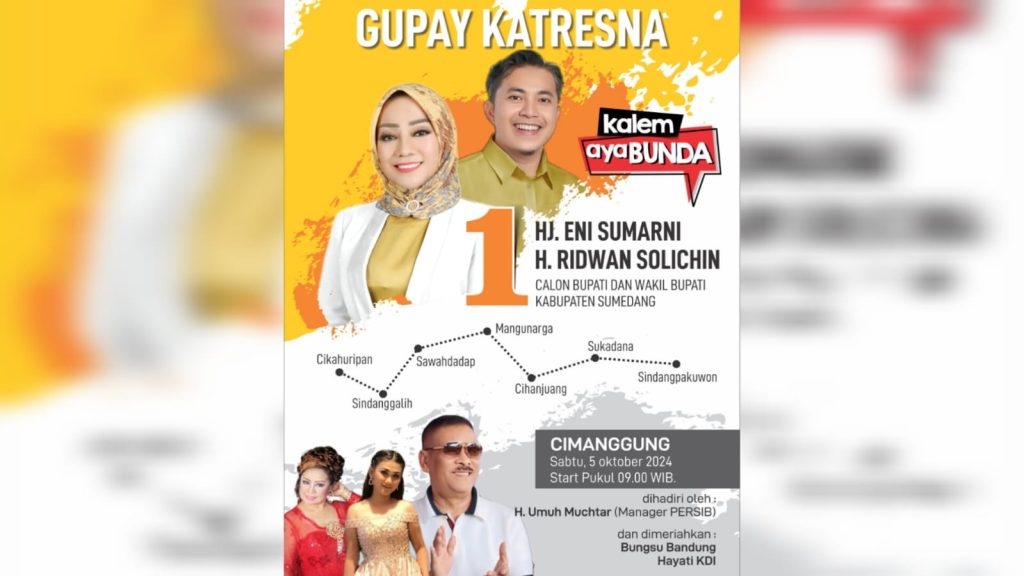 FAJARNUSANTARA.COM- Pasangan Calon Bupati dan Wakil Bupati Sumedang Nomor Urut 1, Eni Sumarni dan Ridwan Solichin, besok Sabtu, 5 Oktober 2024, akan menyapa warga Kecamatan Cimanggung dalam acara kampanye tatap muka pertemuan terbatas. Jumat 4 Oktober 2024.