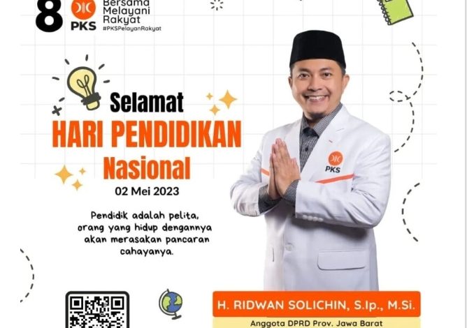 FAJARNUSANTARA.COM,- Sekretaris DPW Partai Keadilan Sejahtera (PKS) Jawa Barat, H. Ridwan Solichin, SIP, MSi, menyampaikan ucapan selamat dalam rangka peringatan Hari Pendidikan Nasional pada tanggal 2 Mei 2023.
