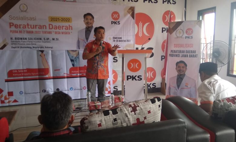 FAJARNUSANTARA.COM — Anggota DPRD Provinsi Jawa Barat, Ridwan Solichin, mensosialisasikan Perda Provinsi Jawa Barat tentang desa wisata di Aula DPD PKS Sumedang, Senin (29/8/2022).
