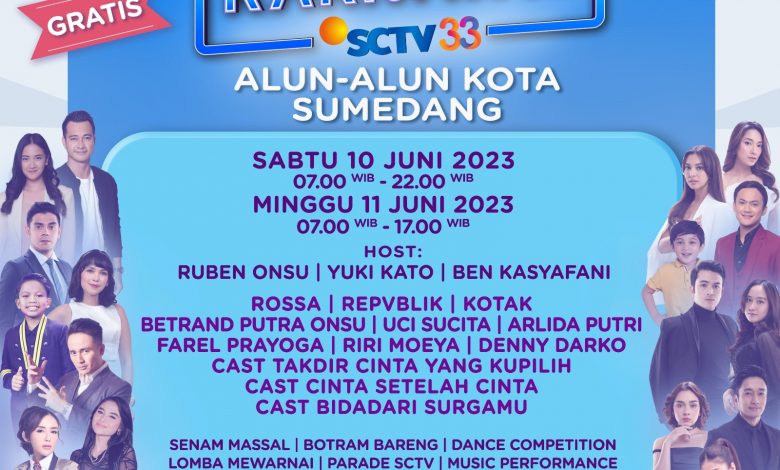 Bagi yang belum sempat menyaksikan “Karnaval SCTV” di Sumedang, jangan khawatir! Acara ini digelar secara gratis di Alun-Alun Sumedang, Jawa Barat, mulai dari Sabtu, 10 Juni 2023, hingga Minggu, 11 Juni 2023.