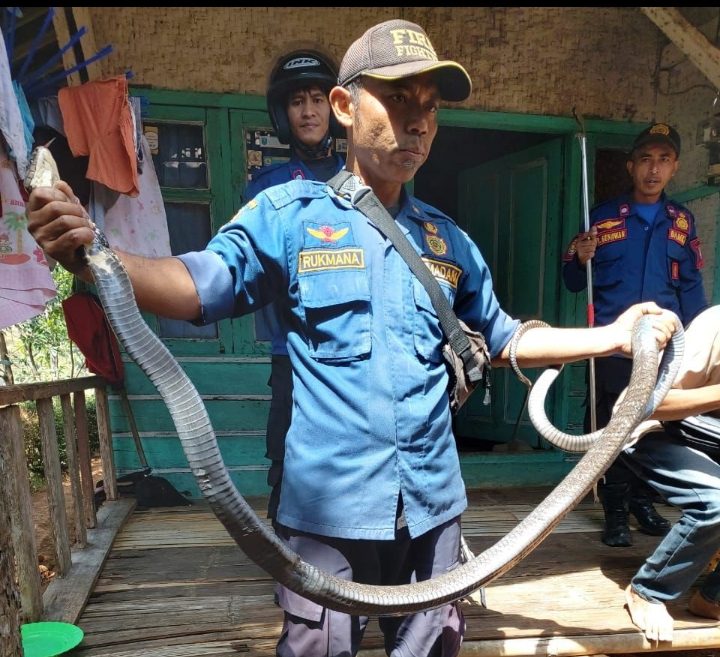 “Benar, seekor ular king kobra hitam dengan panjang 2 meter ditemukan berada di bawah lemari dapur rumah warga,” ujar Kepala Bidang Pemadam Kebakaran dan Penyelamatan Satpol PP, Cece Ruhiat, Jumat siang.