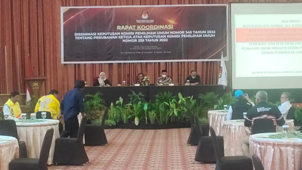 JATINANGOR – Komisi Pemilihan Umum (KPU) Kabupaten Sumedang menggelar Rapat Koordinasi (Rakor) terkait diseminasi Keputusan KPU Nomor 345 Tahun 2022 tentang Perubahan Ketiga atas Keputusan Komisi Pemilihan Umum Nomor 259 Tahun 2022. di Hotel Puri Khatulistiwa Jatinangor. Rabu (28/09).