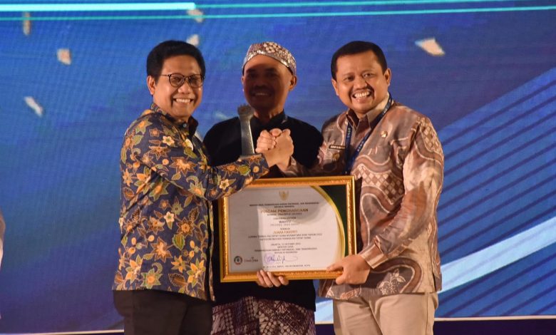 Piala dan piagam penghargaan diserahkan Menteri Desa Pembangunan Tertinggal dan Transmigrasi Abdul Halim Iskandar kepada Bapak Wahyu didampingi Bupati Sumedang H. Dony Ahmad Munir di Aston Cirebon Hotel & Convention Center, Rabu (19/10/2022).