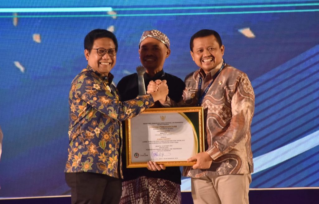 Piala dan piagam penghargaan diserahkan Menteri Desa Pembangunan Tertinggal dan Transmigrasi Abdul Halim Iskandar kepada Bapak Wahyu didampingi Bupati Sumedang H. Dony Ahmad Munir di Aston Cirebon Hotel & Convention Center, Rabu (19/10/2022).