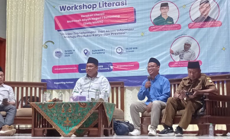 FAJARNUSANTARA, Cimalaka – Dalam rangka Lounching Gerakan Literasi MAN 1 Sumedang (GELIS MANIS) tim penggerak Literasi MAN 1 Sumedang kolaborasi dengan Perpustakaan MAN 1 Sumedang gelar Talkshow Literasi Transformatif dengan tema “Dari Akses Informasi Menuju Produksi Karya dan Prestasi”. Selasa (14/10/2025).