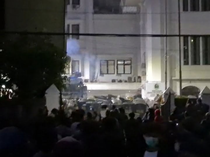 Pihak kepolisian yang berjaga sempat membalas dengan tembakan gas air mata untuk membubarkan massa.