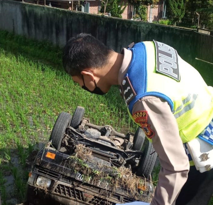 “Mobil kemudian masuk ke dalam parit dan terbalik di sawah,” kata Kasat Lantas, Jumat (14/4/2023).