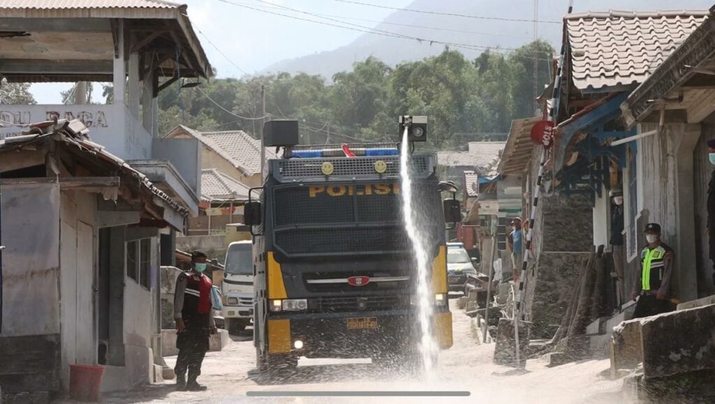 Pihaknya, hadir guna membantu masyarakat yang terdampak abu vulkanik, kita bantu dengan menggunakan Water Canon supaya biar cepat bersih.
