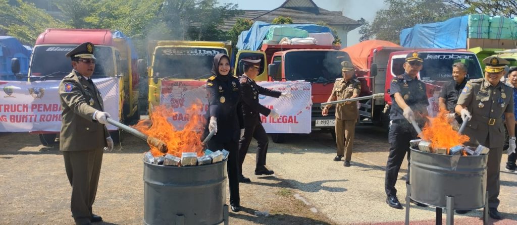 FAJARNUSANTARA.COM- Puluhan truk membawa sekitar 10 juta batang rokok ilegal berhasil dimusnahkan oleh Pemerintah Daerah (Pemda) Sumedang. Pemusnahan ini melibatkan sejumlah instansi terkait seperti Satpol PP, Kejaksaan, TNI, Polri, dan Bea Cukai.