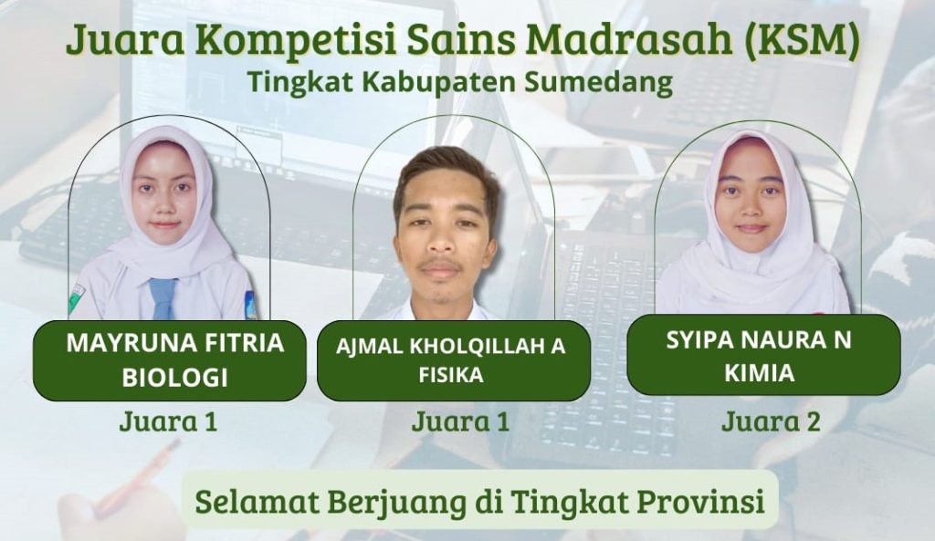 Berikut adalah siswa MAN 1 Sumedang yang meraih juara dalam KSM MA tingkat Kabupaten Sumedang tahun 2024 yaitu Ajmal Kholqillah Afthon Mubarok (Juara 1 Fisika Terintegrasi), Mayruna Fitria (Juara 1 Biologi Terintegrasi), dan Syipa Naura Nazipa (Juara 2 Kimia Terintegrasi)