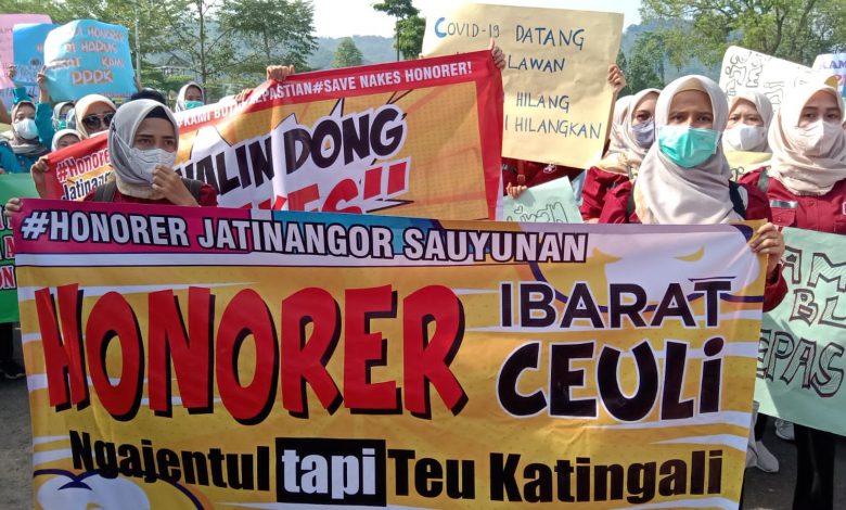FAJARNUSANTARA.COM, SUMEDANG – Imbas surat Menteri Pendayagunaan Aparatur Negara dan Reformasi Birokrasi nomor B/185/M.SM.02.03/2022, berisi tentang penghapus tenaga honorer di Tahun 2023, membuat ratusan Tenaga Kesehatan (Nakes) dan non Nakes honorer di Kabupaten Sumedang menggelar demo di depan Gedung DPRD Sumedang, Selasa (19/7).