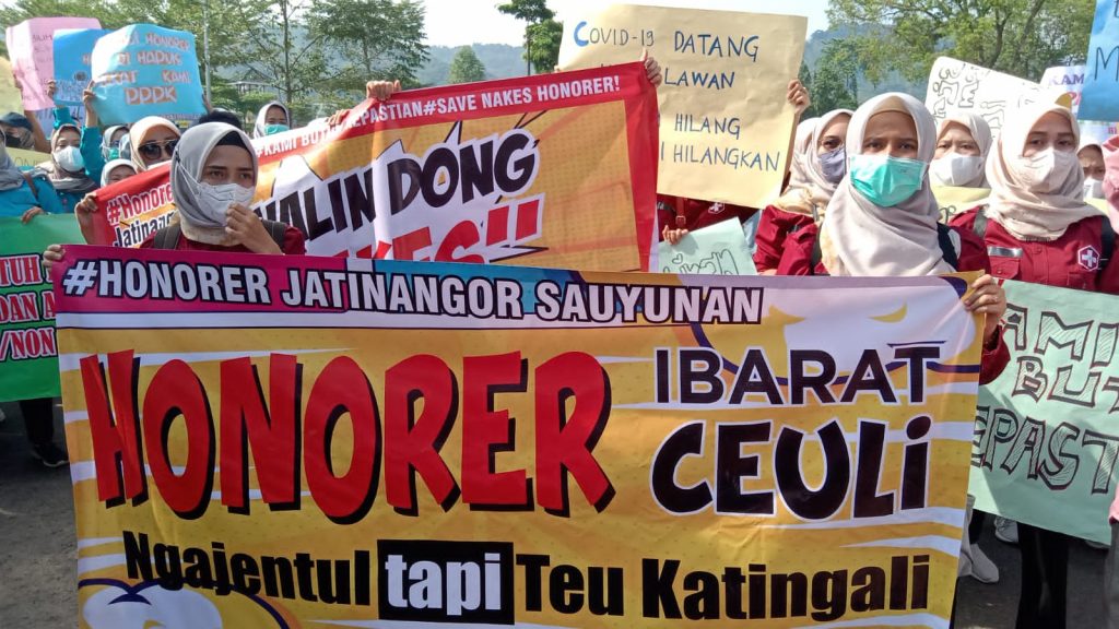 FAJARNUSANTARA.COM, SUMEDANG – Imbas surat Menteri Pendayagunaan Aparatur Negara dan Reformasi Birokrasi nomor B/185/M.SM.02.03/2022, berisi tentang penghapus tenaga honorer di Tahun 2023, membuat ratusan Tenaga Kesehatan (Nakes) dan non Nakes honorer di Kabupaten Sumedang menggelar demo di depan Gedung DPRD Sumedang, Selasa (19/7).