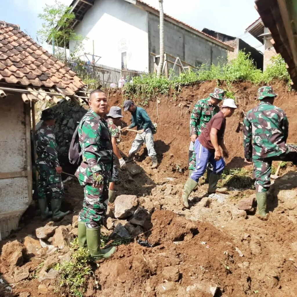 Sumedang, Koramil 104 /tanjungsari berbaur bersama warga bantu rumah Bu apong yang tertimpa Tebing Pembatas, tidak ada korban jiwa.
