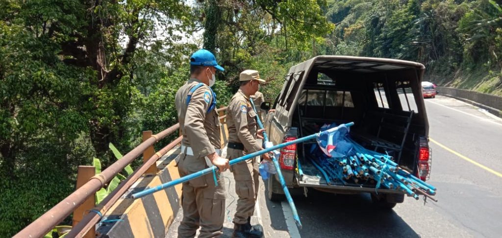 FAJARNUSANTARA.COM.- Diduga dipasang tidak sesuai pada tempatnya, Satuan Polisi (Satpol) Pamong Praja (PP) Kabupaten Sumedang melakukan penertiban spanduk, baligho, banner dan bendera disepanjang Jalan Raya Tanjungsari-Sumedang. Senin (19/09).