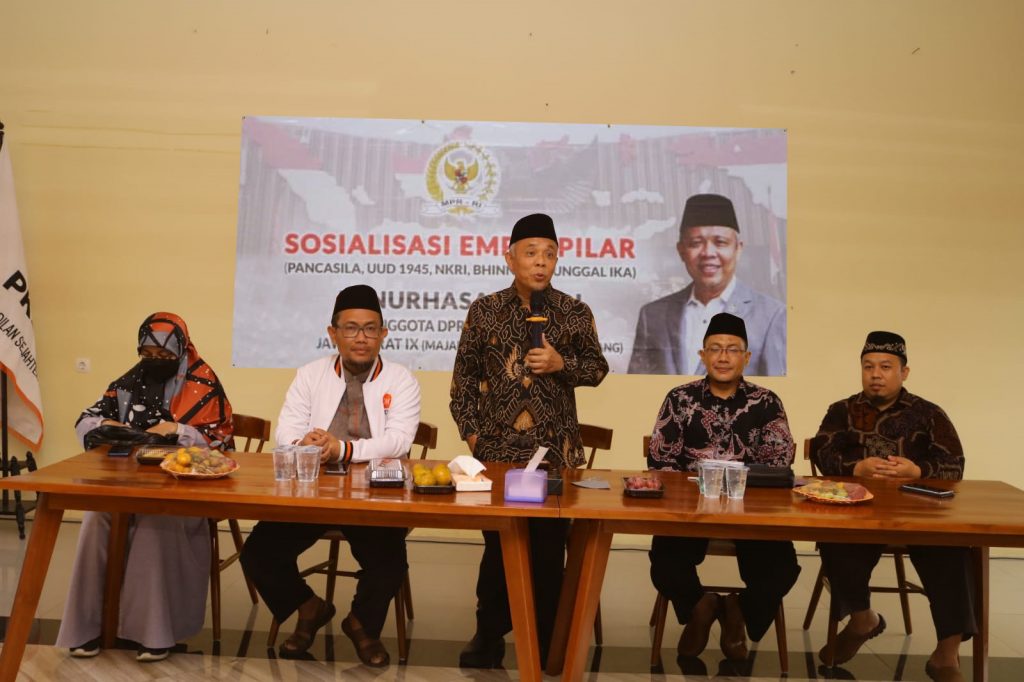 MAJALENGKA – Anggota MPR RI Fraksi PKS Dapil Jawa Barat IX, KH. Nurhasan Zaidi menggelar kegiatan Sosialisasi 4 Pilar Kebangsaan MPR RI dan Buka Puasa Bersama dengan pimpinan, pengurus DPD PKS Kabupaten Majalengka serta Tokoh Ormas dan Masyarakat setempat di RM Cibiuk, Majalengka, Sabtu (16/4/22).