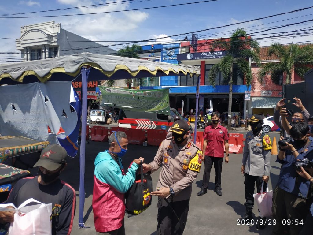 FAJARNUSANTARA, SUMEDANG – Para pengemudi becak gowes, becak motor (cator) termasuk kusir delman di Kabuaten Sumedang Provinsi Jawa Barat, dapat sedikit bernapas lega. Di tengah masa pandemi covid-19, mereka masih mendapat kepedulian dari Jajaran Polres Sumedang dan Kodim 0610/Sumedang, Selasa (29/9).