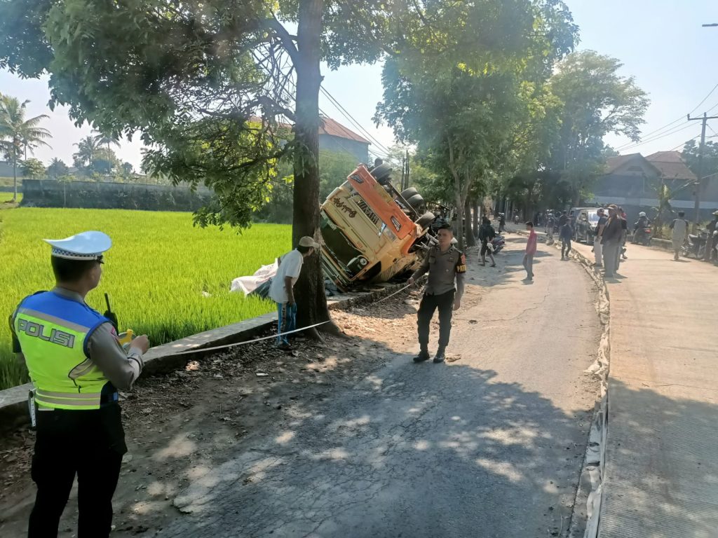 “Bagian ban depan dan ban belakang sebelah kanan truk melintasi jalan yang miring ke kanan, kemudian terguling ke bahu jalan sebelah kanan,” paparnya.