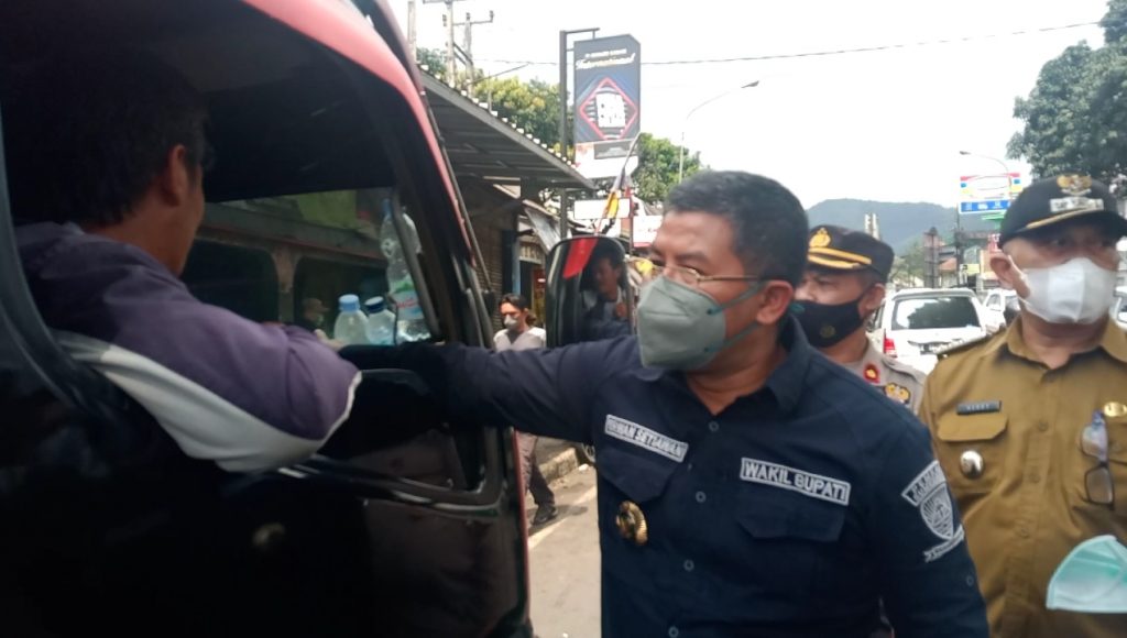 Wakil Bupati Sumedang didampingi Forkopimcam Jatinangor meninjau pelaksanaan Operasi Yustisi Protokol kesehatan Covid-19. Wabup sempat memberhentikan kendaraan Elf dan mengingatkan sang supir untuk pakai masker, sekaligus memberikan masker.
