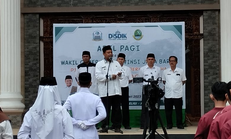 FAJARNUSANTARA.COM,- Wagub Jabar UU Ruzalul Ulum mengikuti apel Pagi bersama para santri dan guru di Ponpes Modern Al-Aqsha Desa Cibeusi Kecamatan Jatinangor Kabupaten Sumedang sekaligus berkeliling monitor setiap sudut ponpes Modern Al-Aqsha. Rabu 25 Januari 2023.