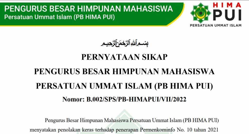 FAJARNUSANTARA.COM, JAKARTA – Pengurus Besar Himpunan Mahasiswa Persatuan Ummat Islam (PB HIMA PUI) dalam rilisnya menyatakan penolakan keras terhadap penerapan Permenkominfo No. 10 tahun 2021, tentang perubahan atas Permenkominfo No. 5 Tahun 2020, tentang Penyelenggaraan Sistem Elektronik (PSE) Lingkup Privat yang ramai dibicarakan.